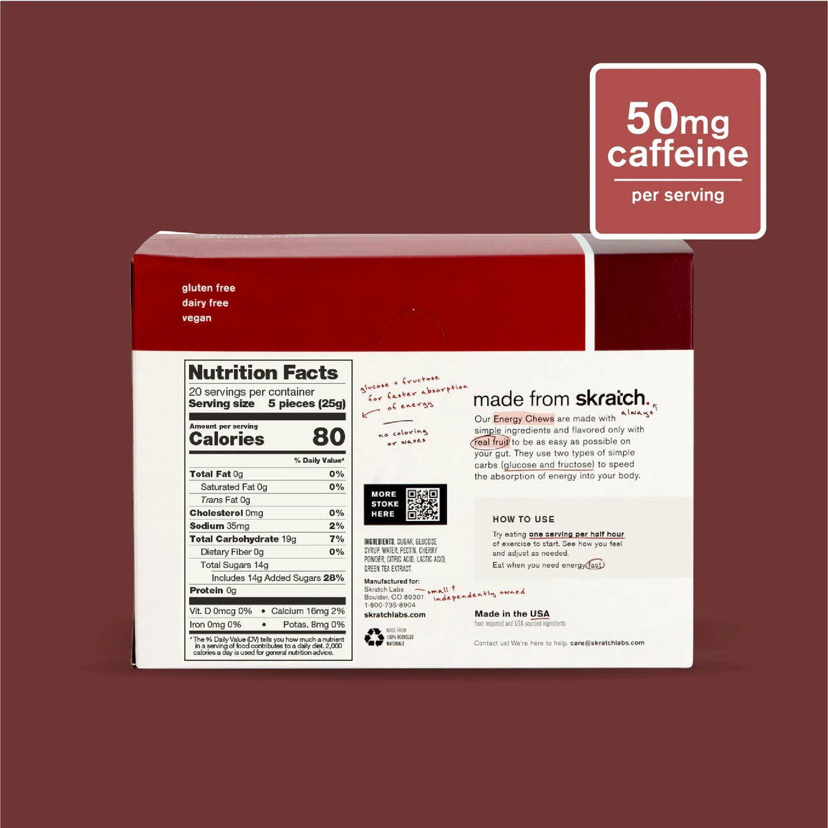 Energy Chews are an easy and convenient source of carbohydrate to help maintain blood sugar and performance during hard and long workouts. Skratch labs uses slightly more water for an improved texture that makes them easier to chew and only real fruit for flavor, for a clean, natural, and incredible taste. It’s like a gumdrop that’s actually a delicious high-performance fruit-drop.