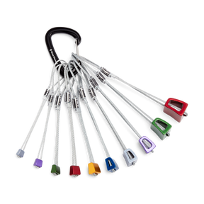 Stoppers No. 4-13 racked on an HotWire carabiner. Black Diamond Stoppers are an essential for every trad rack, designed with a transverse taper that permits sideways placements in flares and shallow seams. Anodized by size, they're quickly identifiable and rounded edges make for easy removal. Each Stopper is equipped with a durable, galvanized steel cable.